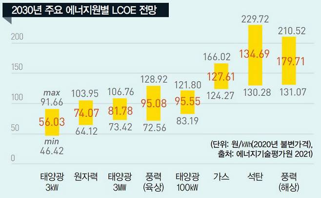 정부는 지난 6월 16일 열린 확대경제관계장관회의에서 국가온실가스 감축 목표(NDC) 달성을 위해 “감축 경로와 이행수단 등은 보다 효율적인 방향으로 재검토하겠다”고 했다. 그간 원자력 업계 전문가들이 원전 비중을 최소 30% 이상 높여야 한다고 주장한 만큼, 재생에너지는 전 정부가 제시했던 30%에서 20%대로 낮추고 원자력은 24%에서 30%대로 올라갈 것으로 예상된다. 탄소중립을 위한 에너지 믹스를 정할 때 발전원별 비용 변화 추세를 무시할 수 없다. 국제에너지기구(IEA)의 분석에 따르면 2025년 시점에서 원자력의 균등화 발전단가(LCOE·설치비·연료비·폐쇄 비용 등 발전 전 과정에 걸친 비용을 발전량으로 나눠 계산)는 수명연장을 통한 장기 운영을 제외하면 태양광·육상풍력과 거의 비슷하거나 높은 것으로 나온다. 재생에너지 기술 발전과 대규모 투자에 따른 학습곡선 효과에 의한 결과다. 2021년 한국자원경제학회가 한국에너지기술평가원의 의뢰로 발간한 ‘균등화 발전비용(LCOE) 메타분석’ 보고서에 따르면, 국내에서도 2030년이 되면 태양광의 LCOE(3㎾의 경우 1㎾h당 56.03원)가 원자력의 LCOE(74.07원)보다 낮아질 것으로 전망된다.