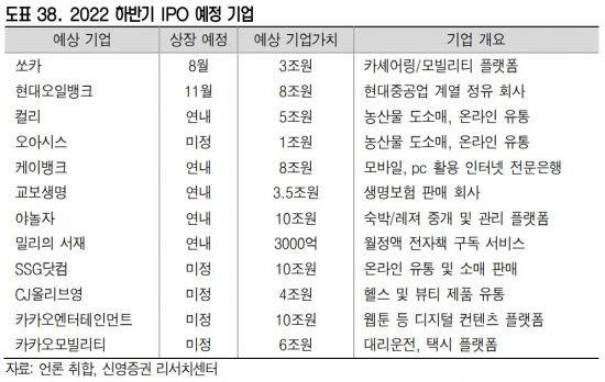 하반기 IPO시장 대어로는 세 번째 IPO에 도전하는 현대오일뱅크를 제시했다. 현대오일뱅크는 지난달 29일 한국거래소의 신규상장 예비심사를 통과했다. 신영증권은 현대오일뱅크가 최근 우크라이나 사태로 국제유가가 급등해 정유업이 초호황을 누리고 있어 올해 안에 IPO를 완료하기로 한 것이라고 추정했다.