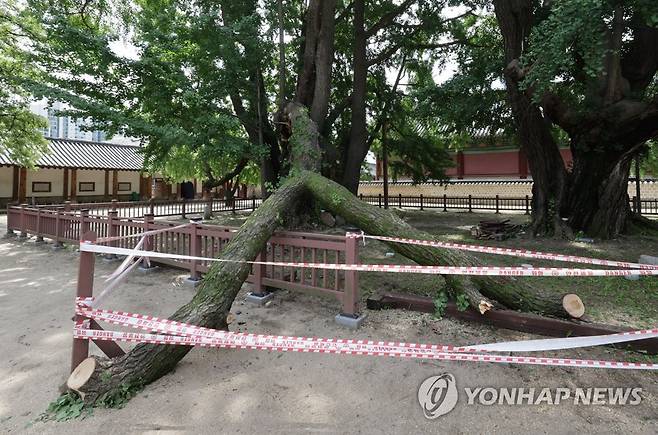 (서울=연합뉴스) 한종찬 기자 = 수령이 400년 정도로 추정되는 서울 성균관 문묘(文廟)의 천연기념물 은행나무가 지지대 교체 작업 중 크게 파손됐다. 1일 종로구청과 성균관 등에 따르면 이날 낮 12시 25분께 문묘의 명륜당 경내에 있는 은행나무 지지대를 교체하는 과정에서 직경 90㎝와 30㎝ 정도의 가지 2개가 부러졌다. 사진은 2일 오전 현장 모습. 2022.7.2