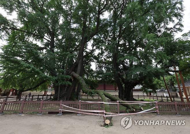(서울=연합뉴스) 한종찬 기자 = 수령이 400년 정도로 추정되는 서울 성균관 문묘(文廟)의 천연기념물 은행나무가 지지대 교체 작업 중 크게 파손됐다. 1일 종로구청과 성균관 등에 따르면 이날 낮 12시 25분께 문묘의 명륜당 경내에 있는 은행나무 지지대를 교체하는 과정에서 직경 90㎝와 30㎝ 정도의 가지 2개가 부러졌다. 사진은 2일 오전 현장 모습. 2022.7.2