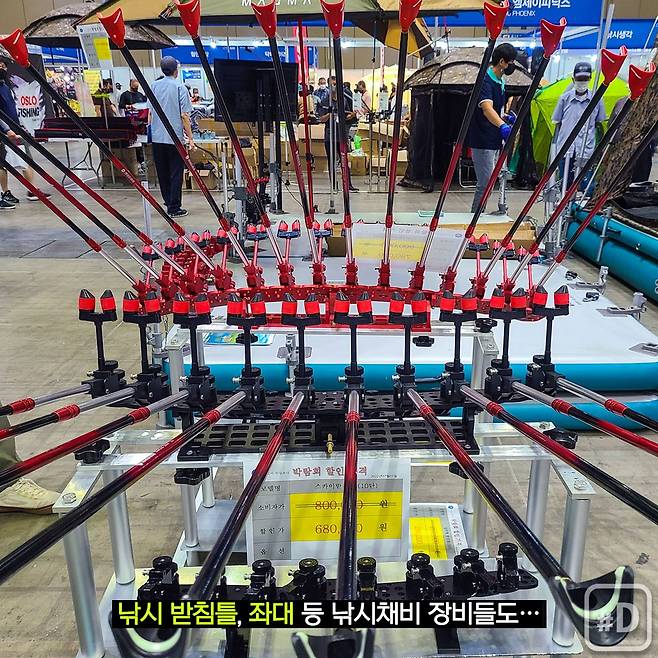 취향별, 용도별 다양한 낚싯대와 릴, 주꾸미 오징어용 가짜미끼인 에기, 갈치잡이용 집어등, 야외에서 사용할 수 있는 배터리, 전자찌, 낚시 받침틀, 낚시 보트 등 수많은 낚시 장비들을 체험할 수 있고, 싸게 구매할 기회에요.