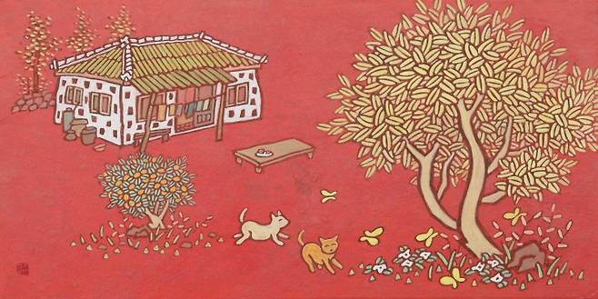 전통 한국화 채색기법과 다르게, 독창적으로 조율해낸 채색과 수묵기법이 동원돼 넘치지 않게 색을 조절하고 필선의 묘미를 살려 내면서 자연과 풍광에는 따스함이 더 번집니다.