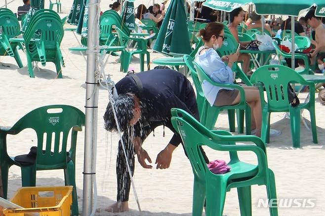 [제주=뉴시스] 양영전 기자 = 제주지역 해수욕장이 개장한 뒤 첫 주말을 맞은 2일 오후 제주 함덕해수욕장에서 한 피서객이 머리를 적시며 더위를 식히고 있다. 3년 만에 '노마스크'로 개장한 도내 12곳 해수욕장은 다음 달 31일까지 2개월간 오전 10시부터 오후 7시까지 운영된다. 2022.07.02. 0jeoni@newsis.com