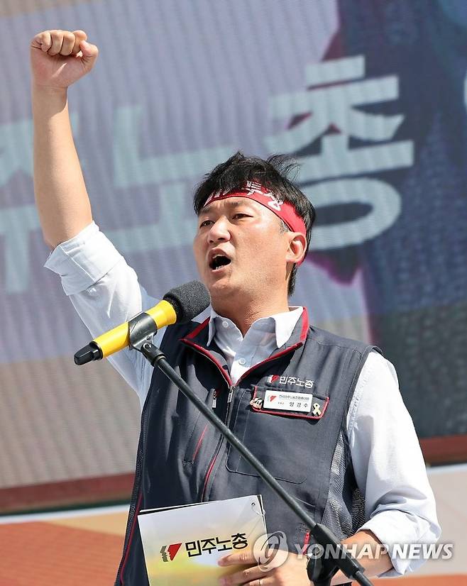 (서울=연합뉴스) 임헌정 기자 = 2일 서울 중구 서울시청 앞 광장과 세종대로 일대에서 열린 2022 민주노총 전국노동자대회에서 양경수 민주노총 위원장이 구호를 외치고 있다. 2022.7.2