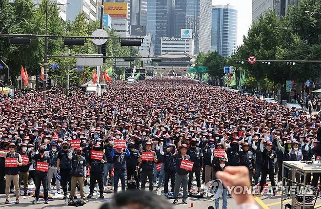 (서울=연합뉴스) 임헌정 기자 = 2일 서울 중구 서울시청 앞 광장과 세종대로 일대에서 전국건설노조 조합원들이 2022 민주노총 전국노동자대회 사전대회를 하고 있다. 2022.7.2