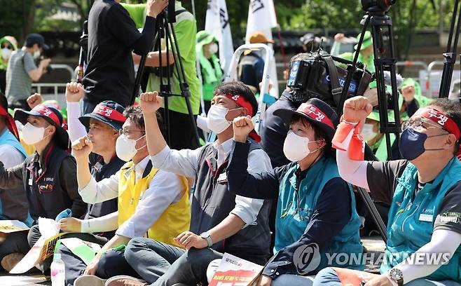 (서울=연합뉴스) 임헌정 기자 = 2일 서울 중구 서울시청 앞 광장과 세종대로 일대에서 열린 2022 민주노총 전국노동자대회에서 양경수 민주노총 위원장이 구호를 외치고 있다. 2022.7.2