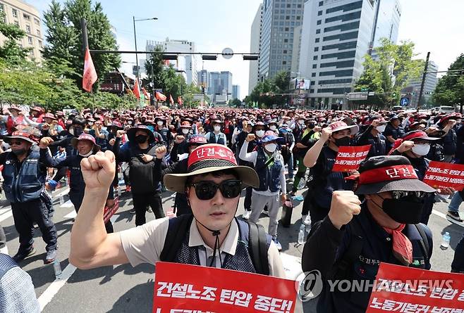 (서울=연합뉴스) 임헌정 기자 = 2일 서울 중구 서울시청 앞 광장과 세종대로 일대에서 전국건설노조 조합원들이 2022 민주노총 전국노동자대회 사전대회를 하고 있다. 2022.7.2