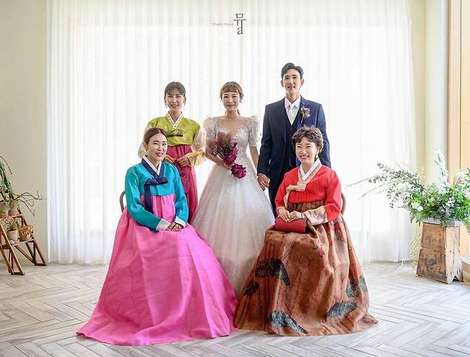 선남선녀 비주얼을 자랑하는 오나미, 박민 커플과 함께 정경미, 김경아, 성현주는 고운 한복을 입고 가족 사진 같은 포즈를 취하고 있다.