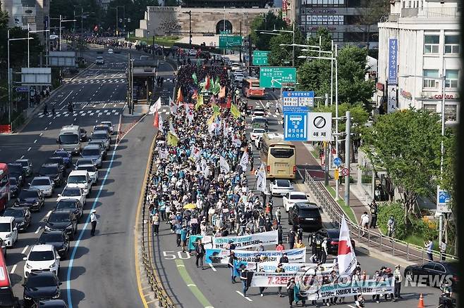 (서울=연합뉴스) 임헌정 기자 = 2일 서울 중구 서울시청 앞 광장과 세종대로 일대에서 열린 2022 민주노총 전국노동자대회 참석자들이 삼각지까지 행진하며 숭례문 앞을 지나고 있다. 2022.7.2
