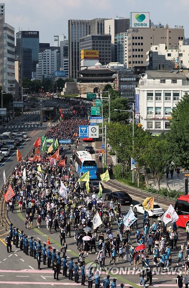 (서울=연합뉴스) 임헌정 기자 = 2일 서울 중구 서울시청 앞 광장과 세종대로 일대에서 열린 2022 민주노총 전국노동자대회 참석자들이 삼각지까지 행진하며 숭례문 앞을 지나고 있다. 2022.7.2