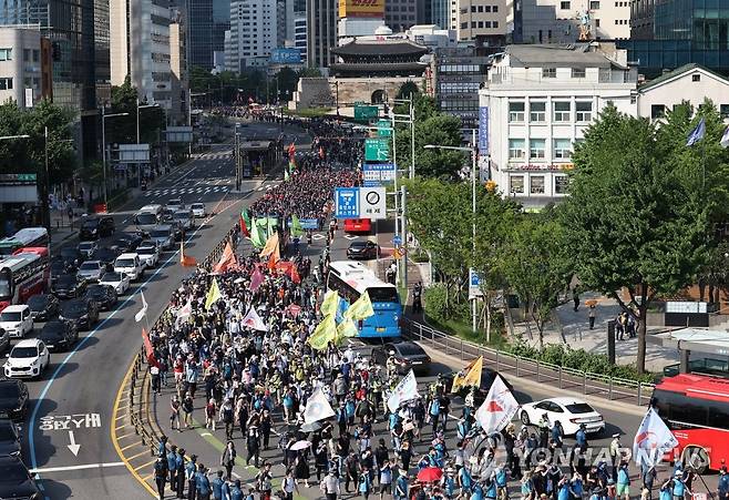 (서울=연합뉴스) 임헌정 기자 = 2일 서울 중구 서울시청 앞 광장과 세종대로 일대에서 열린 2022 민주노총 전국노동자대회 참석자들이 삼각지까지 행진하며 숭례문 앞을 지나고 있다. 2022.7.2