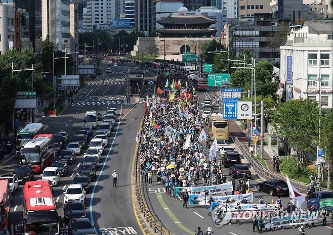 (서울=연합뉴스) 임헌정 기자 = 2일 서울 중구 서울시청 앞 광장과 세종대로 일대에서 열린 2022 민주노총 전국노동자대회 참석자들이 삼각지까지 행진하며 숭례문 앞을 지나고 있다. 2022.7.2