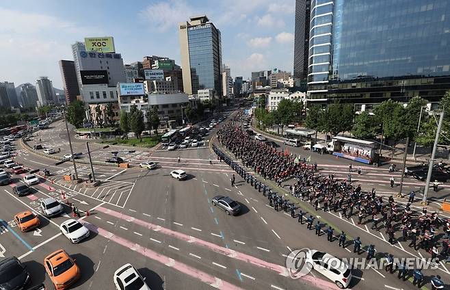 (서울=연합뉴스) 임헌정 기자 = 2일 서울 중구 서울시청 앞 광장과 세종대로 일대에서 열린 2022 민주노총 전국노동자대회 참석자들이 삼각지까지 행진하며 숭례문 앞을 지나고 있다. 2022.7.2