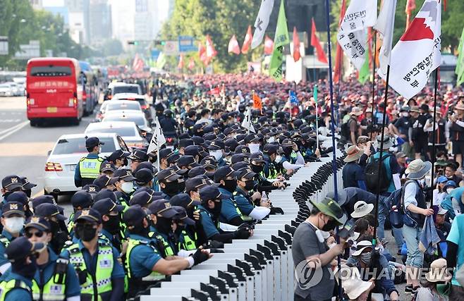 (서울=연합뉴스) 임헌정 기자 = 2일 민주노총 전국노동자대회 참가자들이 서울 용산구 삼각지역 인근에서 정리 집회를 하고 있다. 2022.7.2