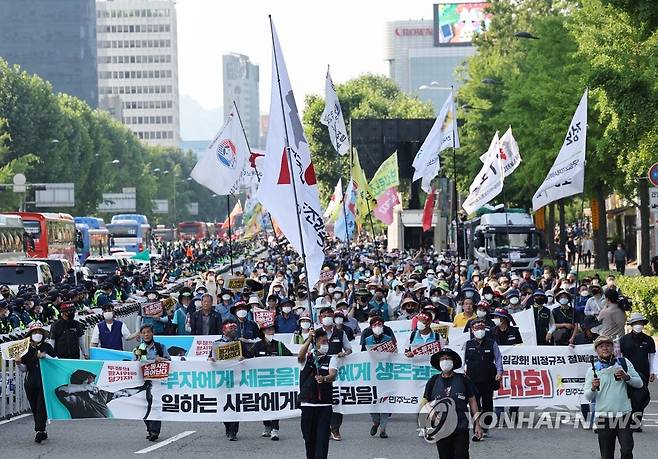 (서울=연합뉴스) 임헌정 기자 = 2일 서울 중구 서울시청 앞 광장과 세종대로 일대에서 열린 2022 민주노총 전국노동자대회 참가자들이 대통령 집무실 근처인 삼각지역까지 행진하고 있다. 2022.7.2