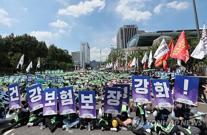 (서울=연합뉴스) 임헌정 기자 = 2일 서울 중구 세종대로에서 민주노총 공공운수노조의 전국노동자대회 사전집회가 열리고 있다. 2022.7.2
