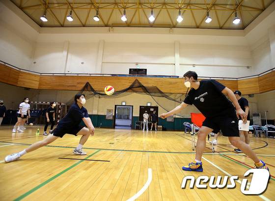 (서울=뉴스1) = 2일 경북 경산에 위치한 영남대학교 천마체육관에서 현대캐피탈 배구단 주최로 열린 배구교실에서 박상하가 유소년들을 대상으로 코칭하고 있다. (현대캐피탈 배구단 제공) 2022.7.2/뉴스1