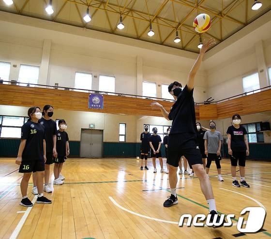 (서울=뉴스1) = 2일 경북 경산에 위치한 영남대학교 천마체육관에서 현대캐피탈 배구단 주최로 열린 배구교실에서 송준호가 유소년들을 대상으로 코칭하고 있다. (현대캐피탈 배구단 제공) 2022.7.2/뉴스1