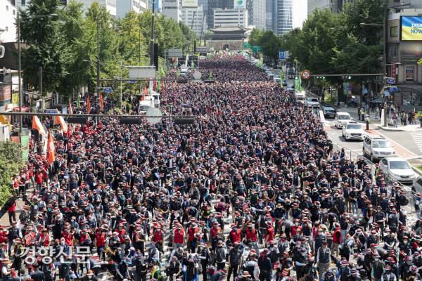 전국민주노동조합총연맹 조합원들이 2일 서울광장 일대에서 '임금 노동시간 후퇴, 중대재해처벌법 등 노동개악 저지, 비정규직 철폐' 등을 요구하며 전국노동자대회를 열고 있다.