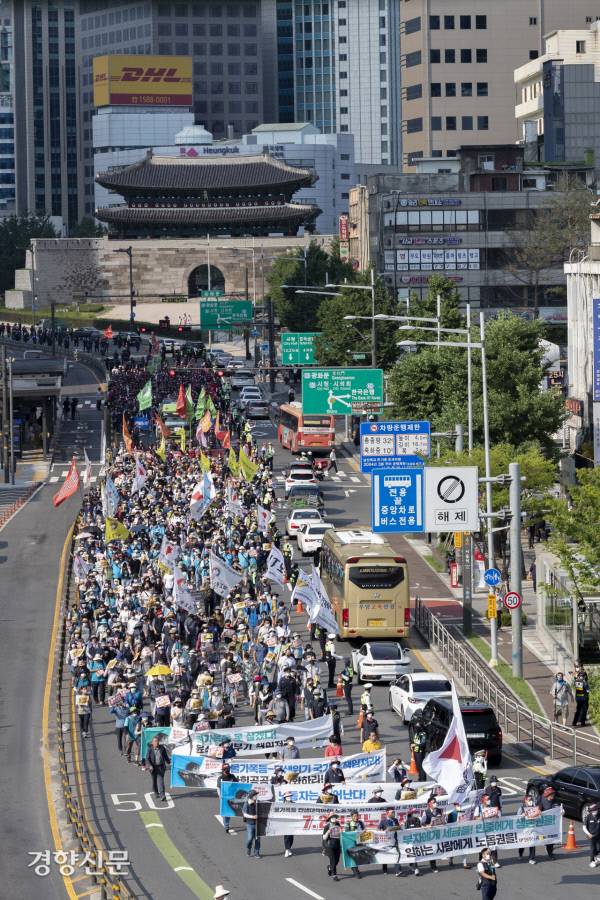 전국민주노동조합총연맹 조합원들이 2일 서울광장 일대에서 '임금 노동시간 후퇴, 중대재해처벌법 등 노동개악 저지, 비정규직 철폐' 등을 요구하는 전국노동자대회를 마치고 용산 대통령실 인근인 삼각지역을 향해 행진하고 있다.