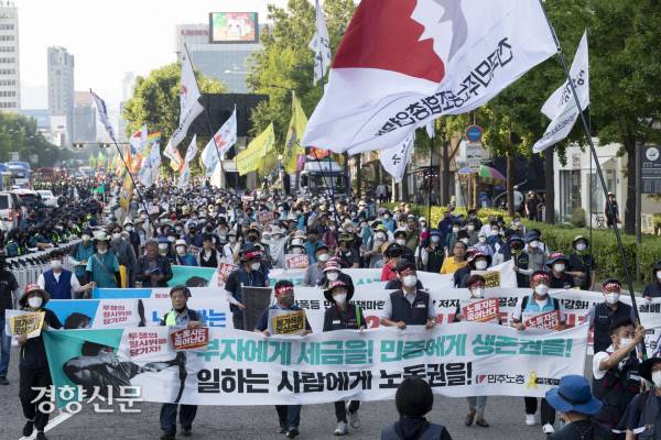 전국민주노동조합총연맹 조합원들이 2일 서울광장 일대에서 '임금 노동시간 후퇴, 중대재해처벌법 등 노동개악 저지, 비정규직 철폐' 등을 요구하는 전국노동자대회를 마치고 용산 대통령실 인근인 삼각지역을 향해 행진하고 있다.