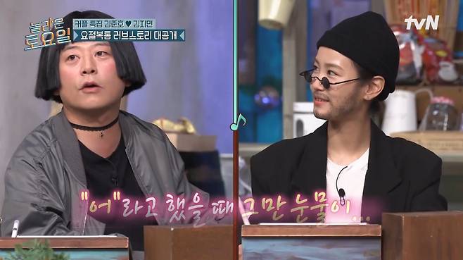 '눈물을 흘린 이유'에 대해 김준호는 "나랑 사귈래?라고 물었는데 '어' 한마디에 확 오더라"고 말했다. 김지민은 "술 먹었을 때는 감동적이었는데 지금은 못 들어주겠다"며 손사래를 쳐 웃음짓게 했다.