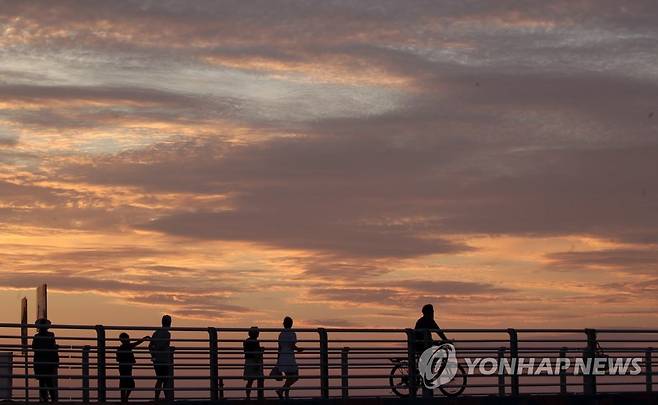 (강릉=연합뉴스) 유형재 기자 = 2일 열대야를 피해 강원 강릉시 강릉항을 찾은 주민들이 시원한 바닷바람이 부는 방파제에서 무더위를 식히고 있다. 2022.7.2