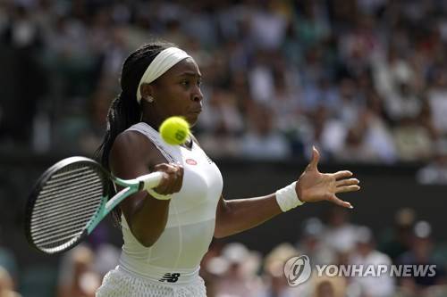 Coco Gauff of the US returns the ball to Amanda Anisimova of the US in a third round women's singles match on day six of the Wimbledon tennis championships in London, Saturday, July 2, 2022. (AP Photo/Alastair Grant)