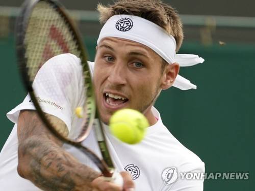 Slovakia's Alex Molcan returns to Taylor Fritz of the US during their men's third round singles match on day six of the Wimbledon tennis championships in London, Saturday, July 2, 2022. (AP Photo/Alberto Pezzali)