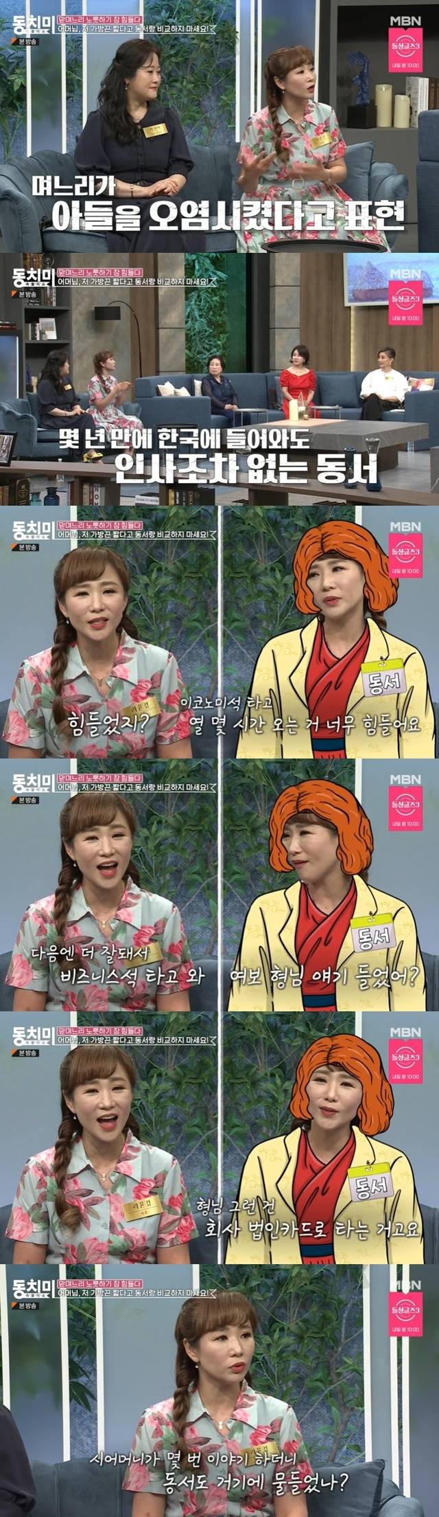 라윤경은 “동서가 시동생이랑 미국에 산다. 몇 년 만에 와서 ‘형님, 반갑습니다’ 이런 분위기가 없다. 남이다. ‘안녕하세요’ 하고 시어머니와 이야기한다. 나를 무시하나? 처음에 그 생각을 했다. 밥 먹는 자리에서 덕담 해주려고 ‘힘들었지?’ 했더니 이코노미 타고 열 몇 시간 오는 것 너무 힘들다고 하더라. ‘다음에는 더 잘 돼서 비즈니스 타고 와’ 했더니 ‘여보 들었어? 저 비싼 걸 나보고 돈 내고 타고 오래. 그건 회사 법카로 타는 거고 내 돈 내고 타는 거 아니에요, 형님 너무 모르신다’ 그러더라”고 동서와의 대화를 전해 다시 한 번 모두를 놀라게 했다.