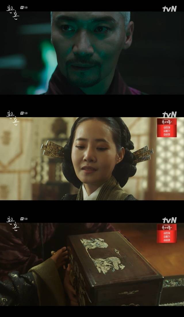 7월 2일 방송된 tvN 토일드라마 ‘환혼’ 5회(극본 홍정은 홍미란/연출 박준화)에서는 왕비 서하선(강경헌 분)이 첫 등장했다.