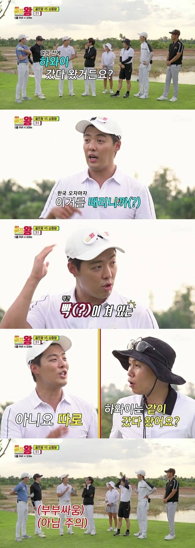 이어 '골프왕3' 출연에 대한 이상화의 반응으로 "얼마 전에 제가 하와이에 다녀왔다. 오자마자 이거('골프왕3')를 때리니 약간 빡이 쳐 있다. 바로 선물을 많이 사가야 하는 상황"이라고 털어놔 웃음케 했다. 강남은 하와이는 부부 여행이었냐는 질문에 "따로"라면서 "싸운 건 아닌데 약간 불편한 상황이다"라고 토로했다.