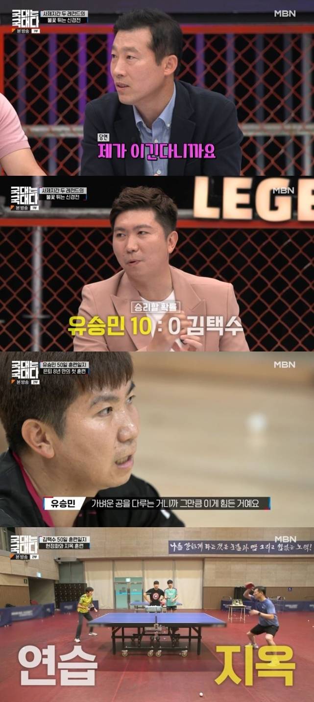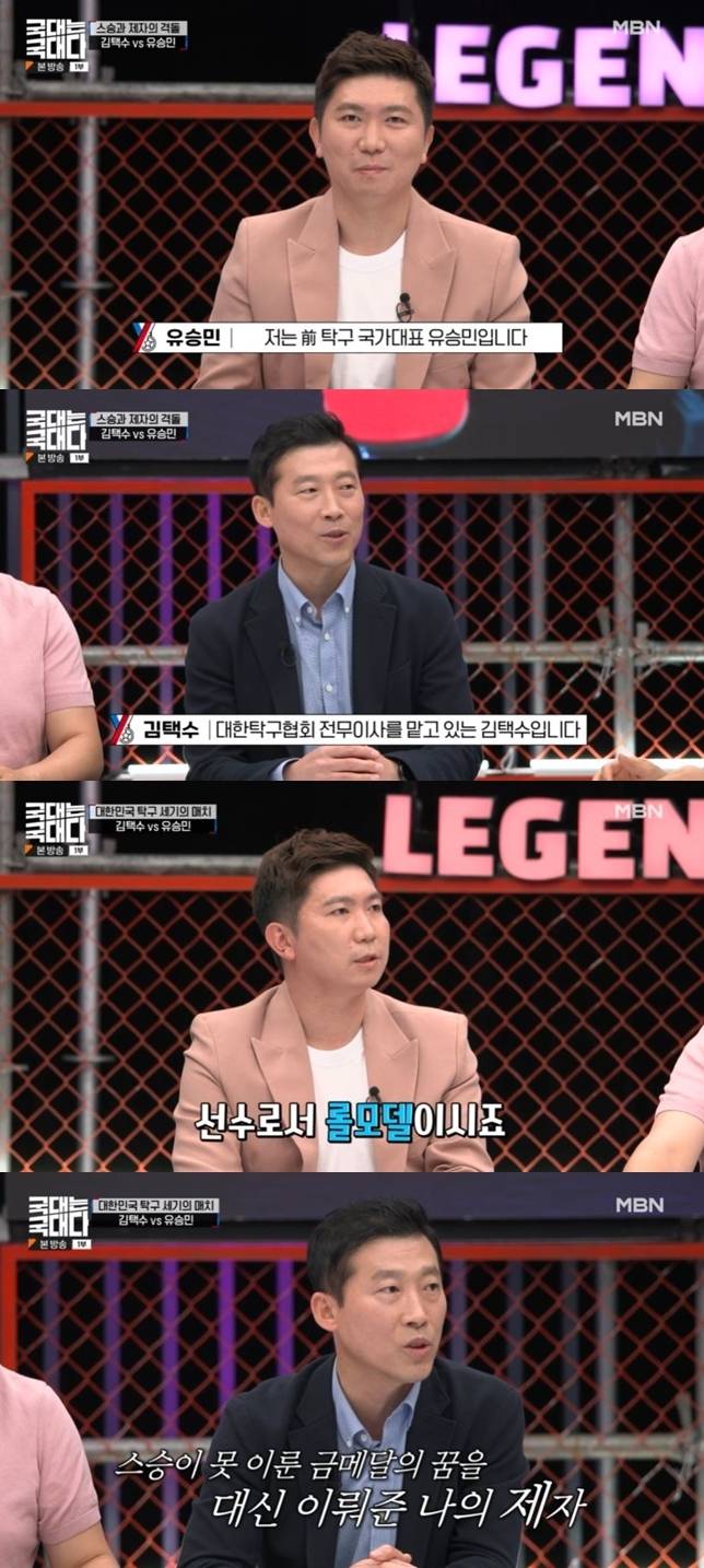 7월 2일 방송된 MBN ‘국대는 국대다’에서는 ‘아시아의 호랑이’ 김택수와 2004 아테네 올림픽 탁구 금메달리스트인 ‘탁구 황제’ 유승민의 사제 간 대결이 이뤄졌다.