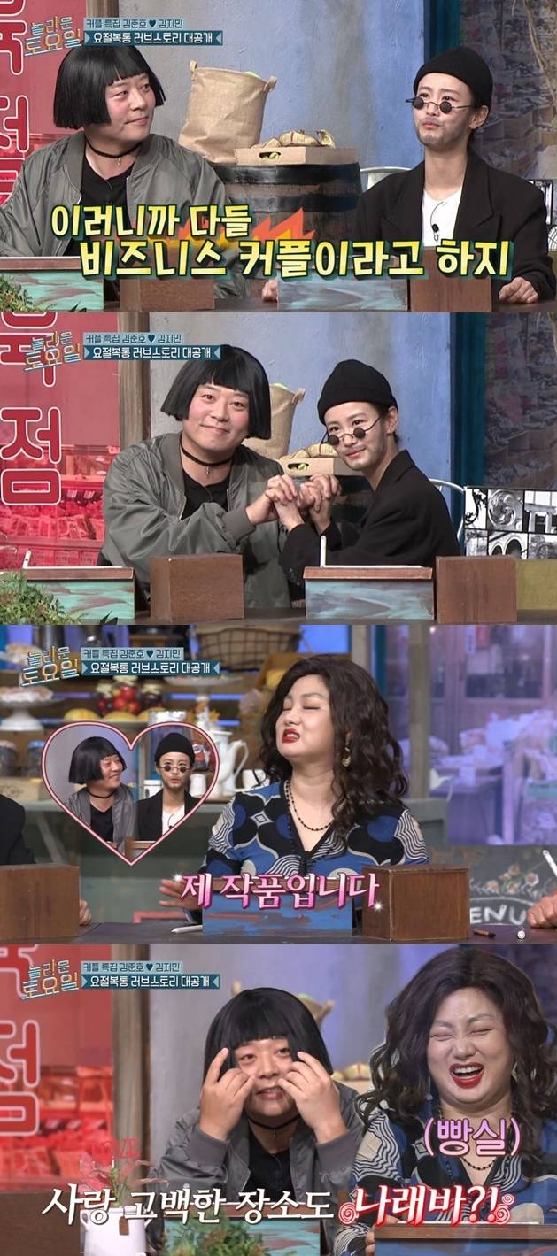 김준호와 김지민은 연애에 얽힌 다양한 에피소드를 방출, 비즈니스 커플이라는 오명을 벗어 던져 시선을 끌었다.