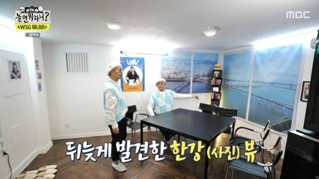이어 사무실에 나타난 하하는 "왜 식당으로 불렀냐"며 불만을 토로하다가, 테이프로 간신히 고정된 한강뷰 사진에 정준하의 의도를 눈치채곤 "한강뷰냐. 뷰가 좋다"고 너스레 떨었다.