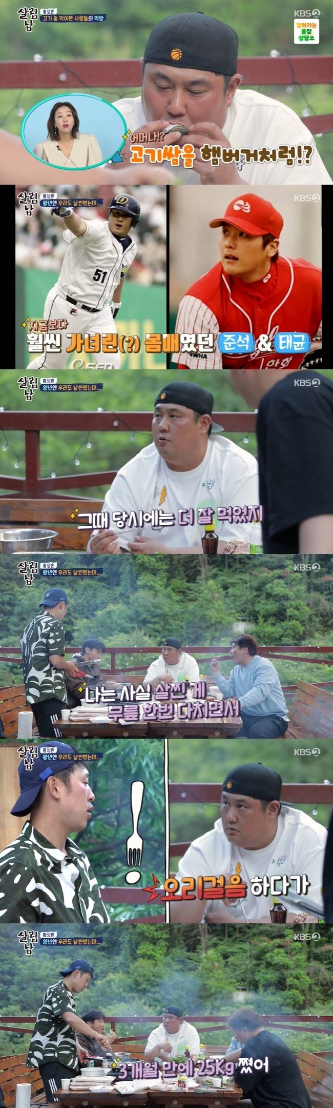 윤석민은 “데뷔했을 때 보면 말랐더라”며 김태균, 최준석의 데뷔 시절을 언급했다. 최준석은 “그때는 더 잘 먹었다. 나는 무릎 한번 크게 다치면서 살이 쪘다”라고 말했다.