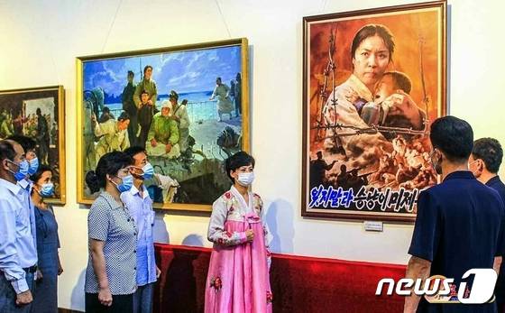 (평양 노동신문=뉴스1) = 북한 평양국제문화회관에서 계급교양 주제 미술전시회가 진행되고 있다고 3일 조선노동당 기관지 노동신문이 보도했다. 북한 주민들이 전시회에서 '잊지 말라 승냥이 미제'라고 적힌 포스터를 보고 있다.
