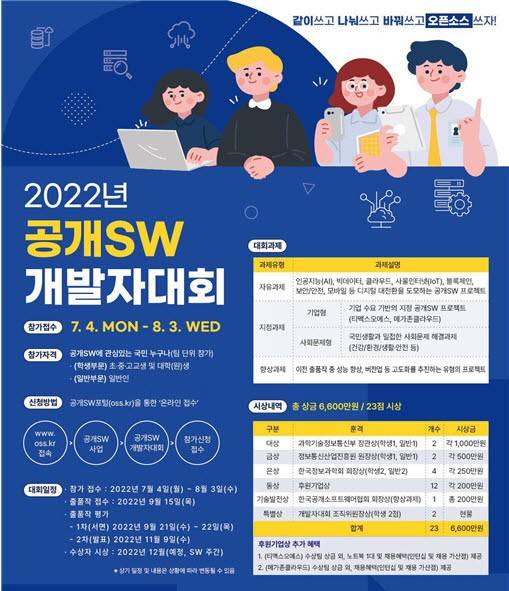 과학기술정보통신부가 4일부터 8월 3일까지 '2022년 공개소프트웨어 개발자대회' 참가자를 모집한다.