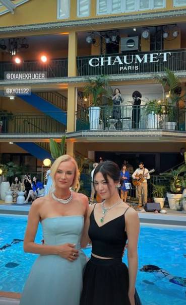 사진 속 송혜교는 다이앤 크루거 옆에서 시크한 포즈를 취하고 있다. 가녀린 어깨라인이 드러나는 검은색 민소매 드레스에 커다란 주얼리로 포인트를 준 모습. 세계적인 미녀로 꼽히는 다이앤 크루거 옆에서도 독보적인 미모를 자랑하고 있다.