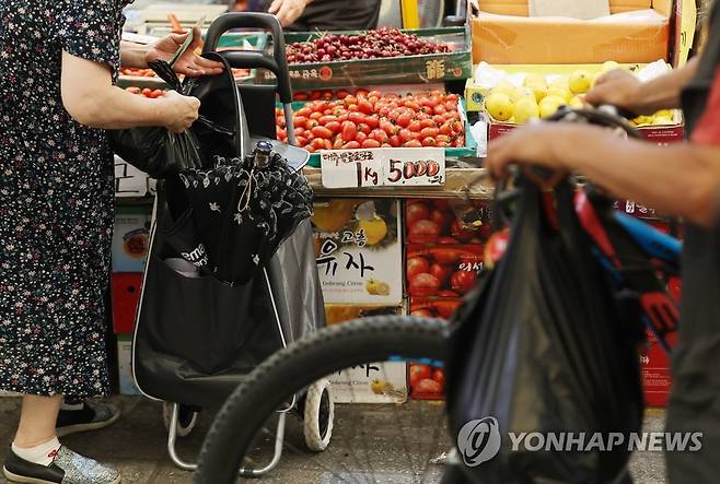 (서울=연합뉴스) 박동주 기자 = 세계 일회용 비닐봉지 없는 날인 3일 서울의 한 재래시장에서 시민들이 비닐봉지에 넣은 식재료를 장바구니에 넣고 있다. 2022.7.3