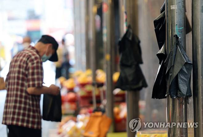 (서울=연합뉴스) 박동주 기자 = 세계 일회용 비닐봉지 없는 날인 3일 서울의 한 재래시장 기둥에 일회용 비닐봉지가 걸려 있다. 2022.7.3