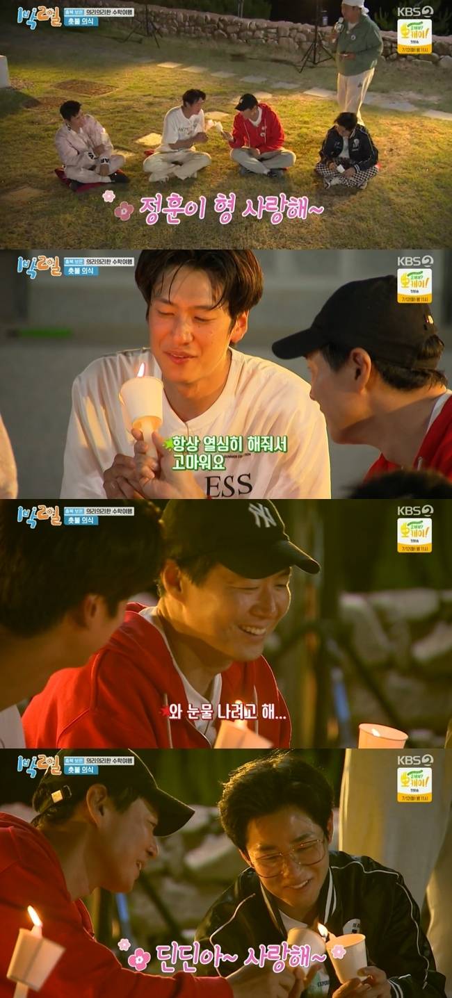 이후 멤버들은 서로를 향한 사랑을 작은 촛불로 전했다. 특히 나인우는 연정훈에게 "정훈이 형 사랑해. 항상 열심히 해줘 고맙다"고 말했고, 연정훈은 "눈물나려 해"라며 눈시울을 붉혀 이목을 집중시켰다. (사진=KBS 2TV '1박2일 시즌4' 캡처)