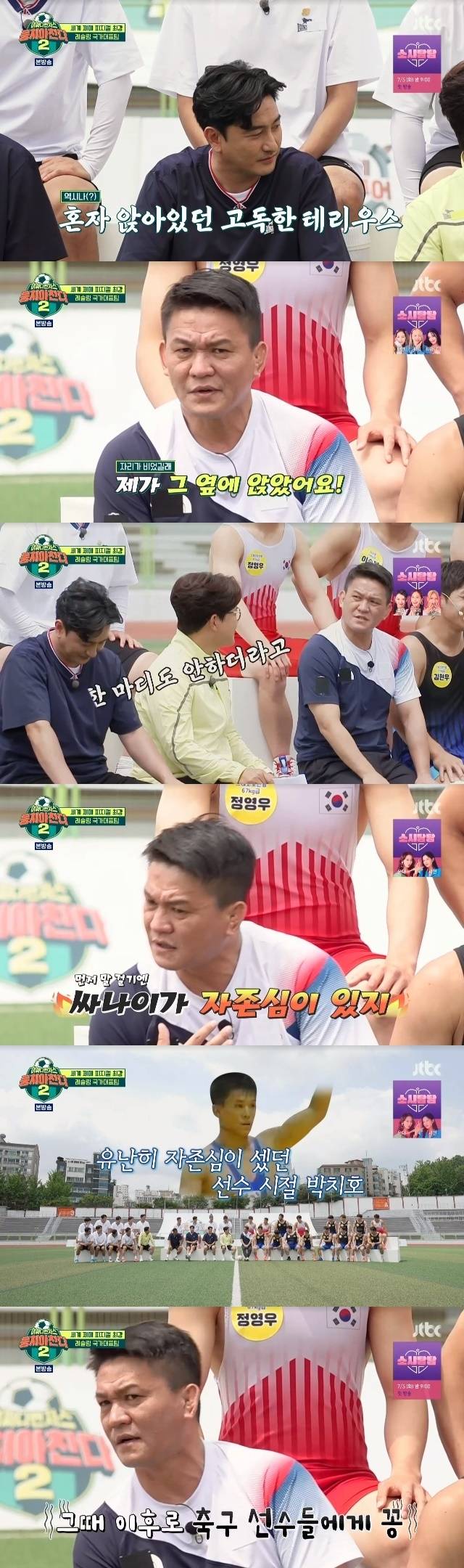 박치호 감독은 "당시 창가 쪽에 안정환 감독이 앉아있는데 아우라가 있잖나. 이번 기회에 친해지면 좋겠다는 생각에 앉았는데 창가만 계속 보시더라. 등을 맞대고 앉았다. 안 감독이 무슨 얘기를 하면 무슨 답을 하지 생각까지 했었다"고 마저 털어놔 웃픔(웃기고 슬픔)을 자아냈다. (사진=JTBC '뭉쳐야 찬다 2' 캡처)
