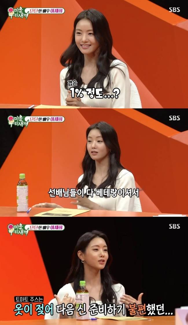서장훈이 감정이 상했던 순간을 묻자 이세희는 "굳이 불편했다면 토마토주스를 맞거나 하면 다음 신을 준비할 때 힘들었던 것 정도다"며 "실제라면 뺨 맞는 게 제일 기분 상할 것 같다"고 답했다.