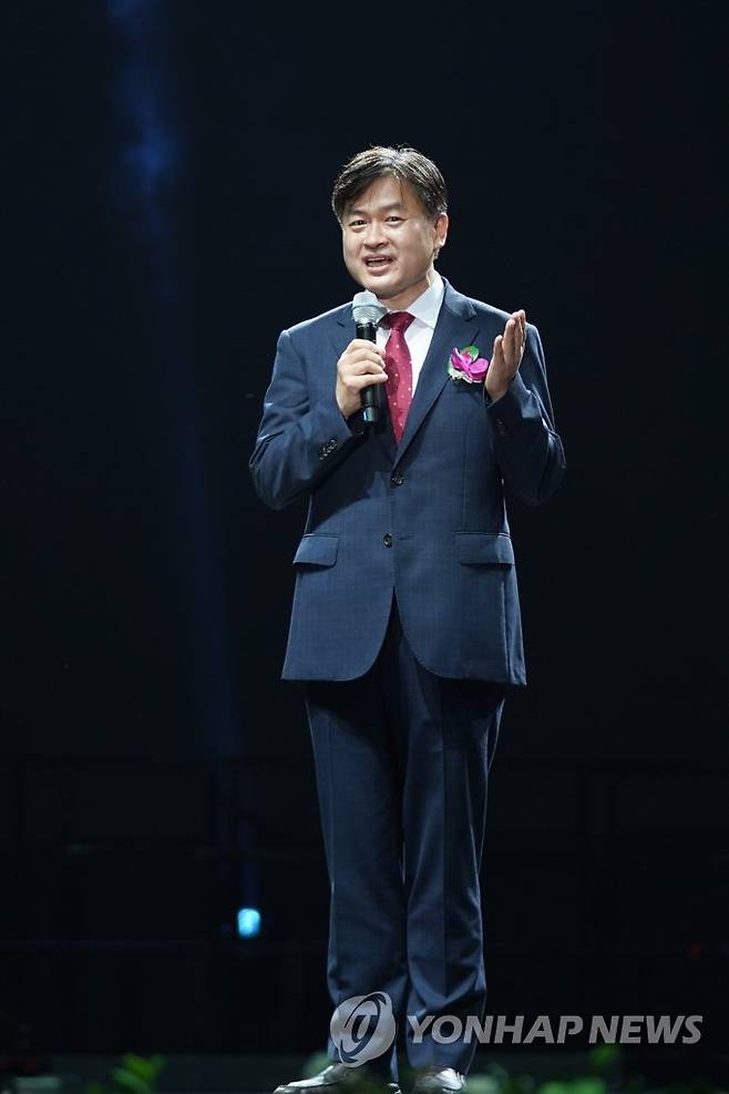 (서울=연합뉴스) 박문택 국제청소년연합 회장이 3일 부산 벡스코에서 열린 '2022 국제청소년연합(IYF) 월드캠프' 개막식에서 개막 선언을 하고 있다. 2022.7.3 [국제청소년연합 제공. 재판매 및 DB 금지]