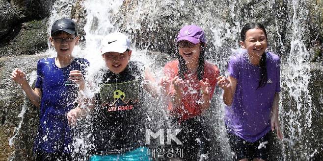 전국에 폭염특보가 내려진 3일 경기도 과천향교 계곡을 찾은 어린이들이 무더위를 날려보내고 있다. 이날 경북 의성의 낮최고 기온이 35.6도를 기록하는 등 전국의 낮기온이 30도를 웃돌았다.
