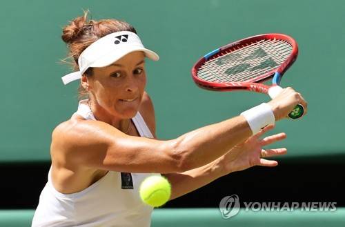 epa10049510 Tatjana Maria of Germany in action against Jelena Ostapenko of Latvia during their women's 4th round match at the Wimbledon Championships in Wimbledon, Britain, 03 July 2022. EPA/KIERAN GALVIN EDITORIAL USE ONLY