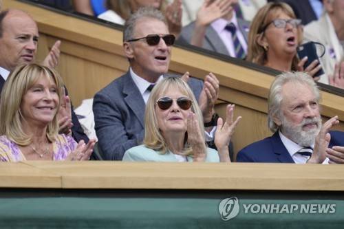 Former model Twiggy applauds during a 100 years of Centre Court celebration on day seven of the Wimbledon tennis championships in London, Sunday, July 3, 2022. (AP Photo/Kirsty Wigglesworth)