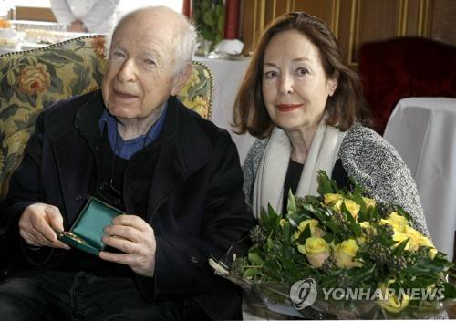 FILE - British theatre director Peter Brook poses with his wife Natasha after being awarded the Great Vermeil medal of Paris, during a reception at the city hall Tuesday, Jan. 25, 2011. Brook, a British theater director known for an influential and distinguished career which saw him garner worldwide acclaim, has died. He was 97. The two-time Tony Award winner, who had settled in France since the 1970s, also directed the film adaptations of his best stage works as well as the 1963 release of “Lord of the Flies”. (AP Photo/Jacques Brinon, File) FILE PHOTO