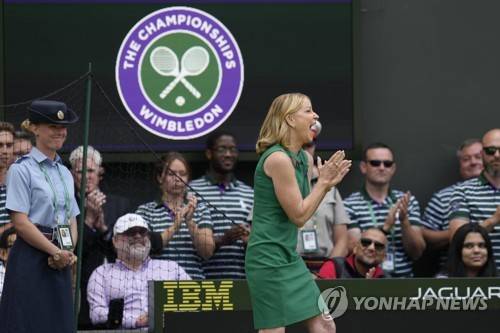 Former Wimbledon singles champion Chris Evert reacts as she arrives for a 100 years of Centre Court celebration on day seven of the Wimbledon tennis championships in London, Sunday, July 3, 2022. (AP Photo/Kirsty Wigglesworth)